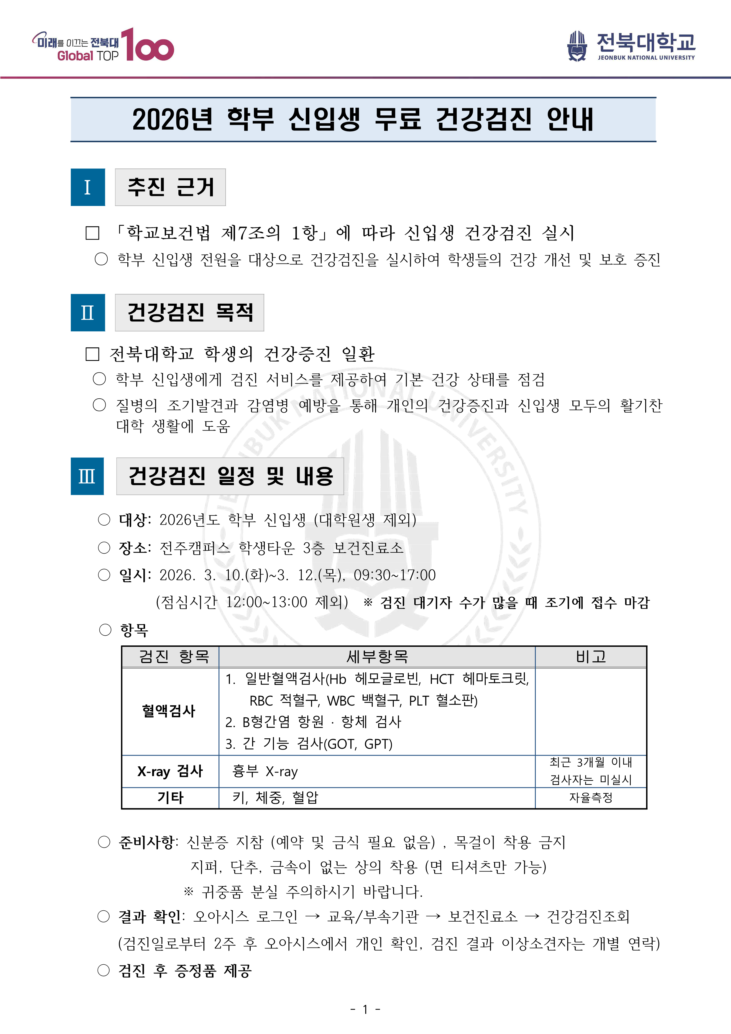 2026년 학부 신입생 무료 건강검진 안내