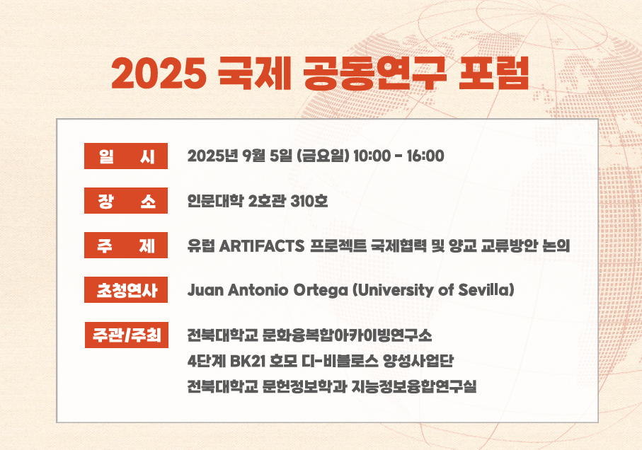○ 주관/주최 : 전북대학교 문화융복합아카이빙연구소, 4단계 BK21 호모 디-비블로스 양성사업단, 전북대학교 문헌정보학과 지능정보융합연구실