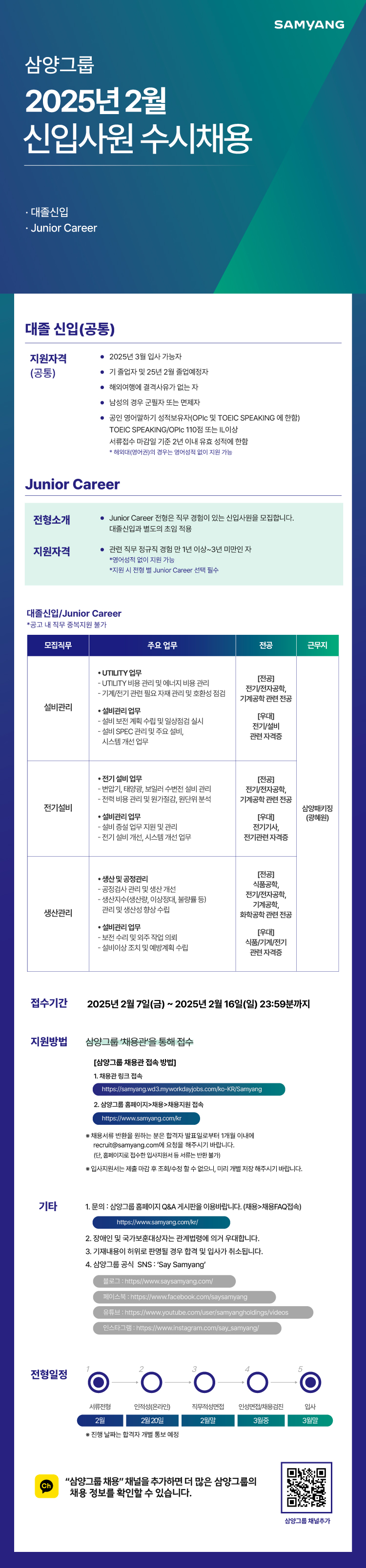 [삼양그룹] 2025년 2월 삼양그룹 신입사원 수시채용 모집(~2/16(일)) 23:59시까지)