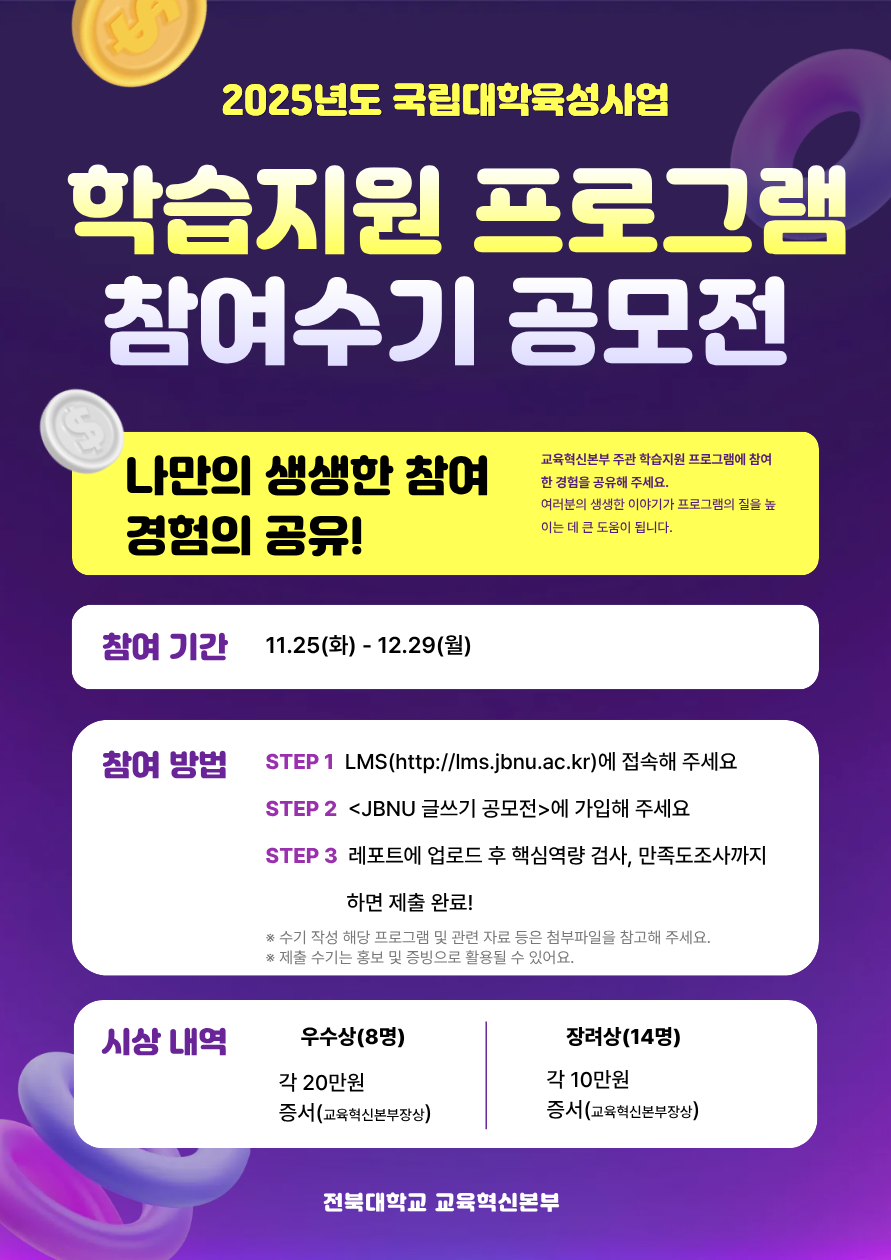 [JBNU 글쓰기 공모전 시리즈 2] 2025학년도 학습지원 프로그램 참여 수기 공모전 안내문.hwp