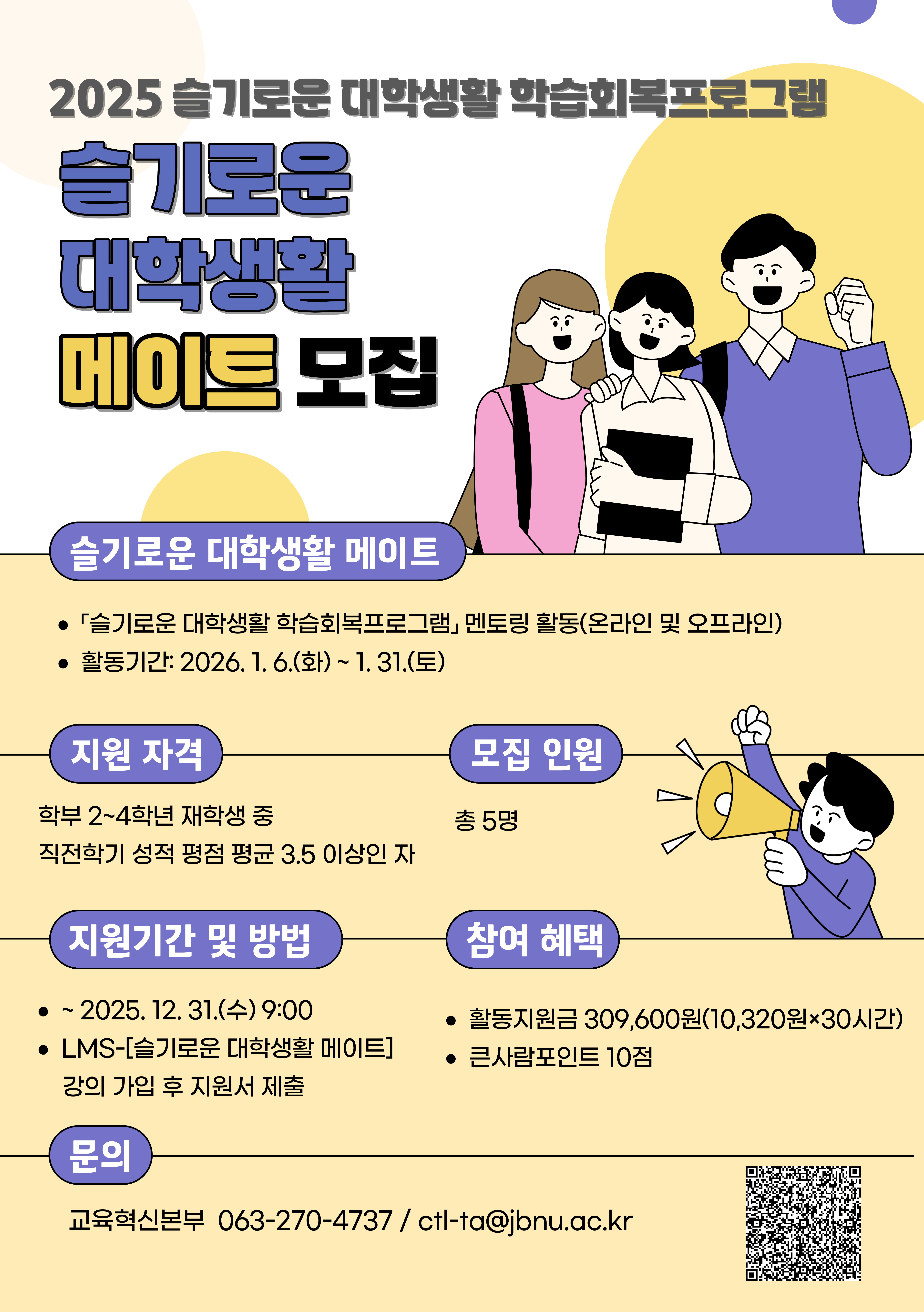 2. 국립대학육성사업의 일환으로「슬기로운 대학생활 학습회복프로그램」의 학생 멘토로서 성적경고자 및 학업 성취 희망 학생의 학업 회복을 지원하는 슬기로운 대학생활 메이트 학생을 다음과 같이 선발하고자 하오니, 관심있는 학생의 참여를 바랍니다.
